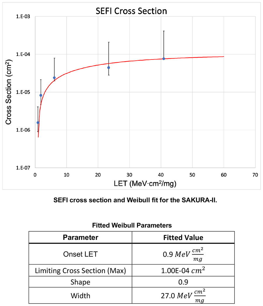 [Figure 3 ǀ Fitted Weibull analysis indicated an onset LET of approximately 0.9 MeV·cm²/mg and a limiting SEFI cross-section on the order of 1×10-4 cm². These parameters indicate suitability for many missions in low Earth orbit, geosynchronous orbit, and cislunar regimes. Source: NASA.]