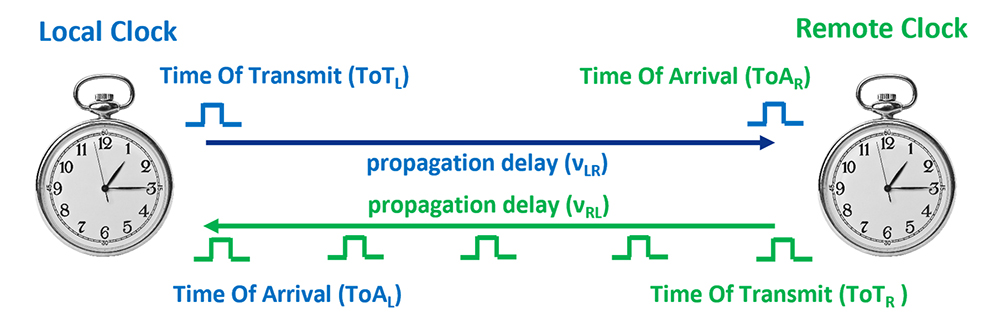 [Figure 2 ǀ A diagram displays the measurements necessary to calculate clock offset and simultaneity. HORDE PNT also deploys methods for translating relative position and orientation across nodes, but these methodologies are not described in this figure.]
