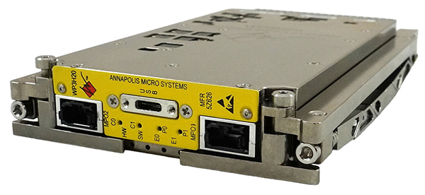 [Figure 1 | Annapolis Micro Systems’ WP3H20 3U OpenVPX switch combines UltraScale+ processing and an Intel SBC with high-density VITA 91 backplane connectivity, designed for low-latency EW, jamming, and radar. Image via Annapolis Micro Systems.]